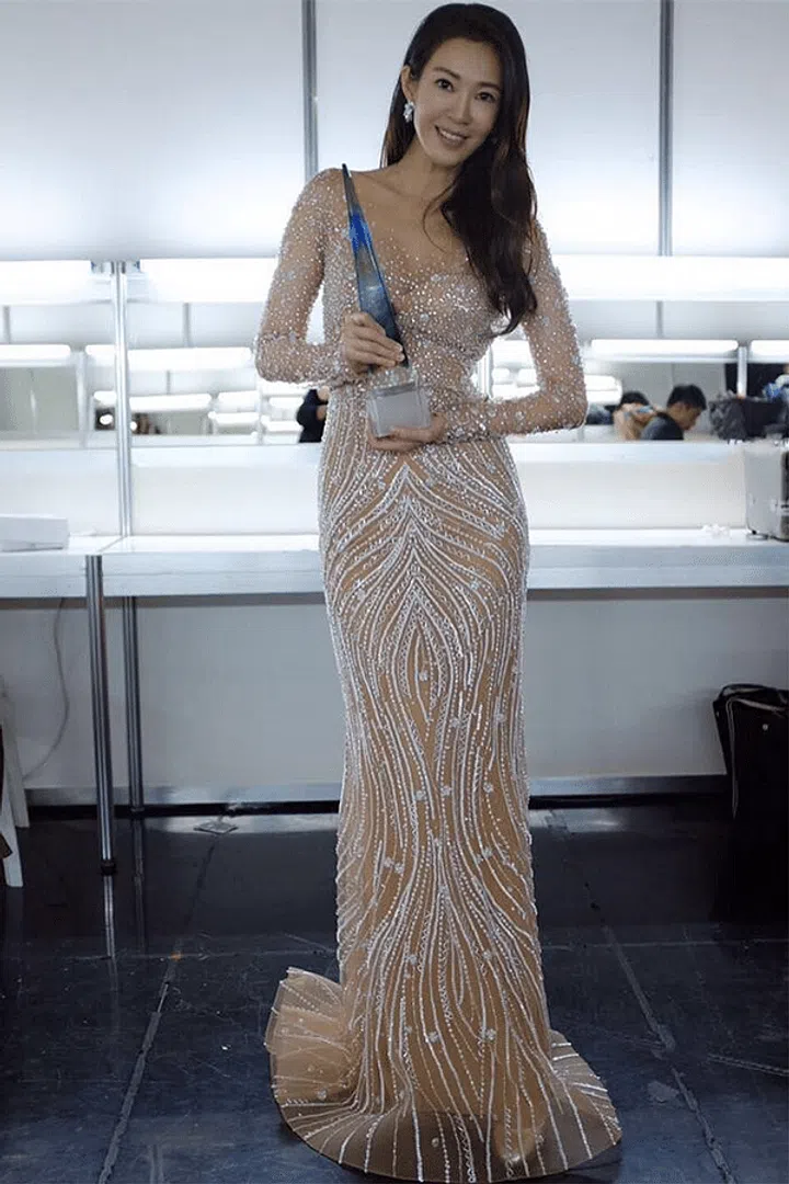 陈凤玲这身Paolo Sebastian透视装仅以粉色燕子刺绣微妙地遮住重要部位,“燕”压全场。