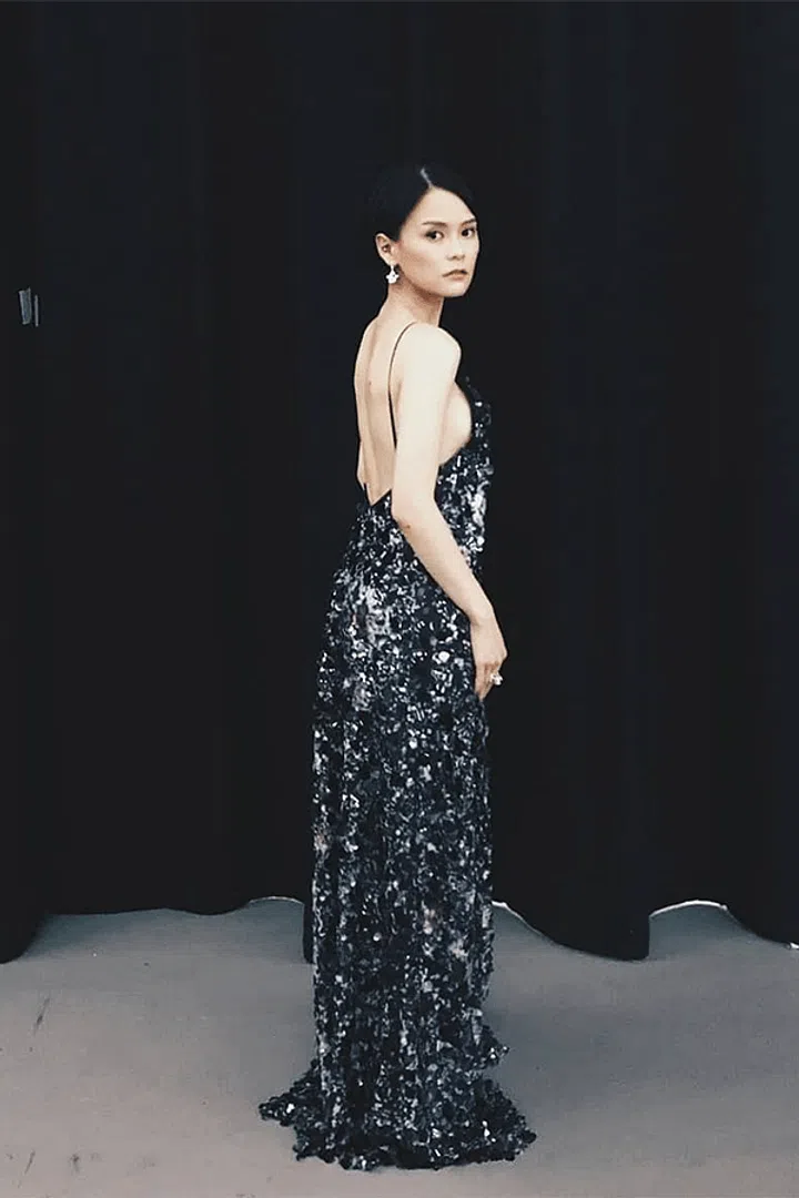 林慧玲身着一袭Alexander McQueen 2021 春季系列中的黑色修身晚礼服亮丽登场,裙子的颈间处绣有立体的珍珠和水晶点缀,身后则是性感迷人的露背设计,展现优雅女人的大方与精致。