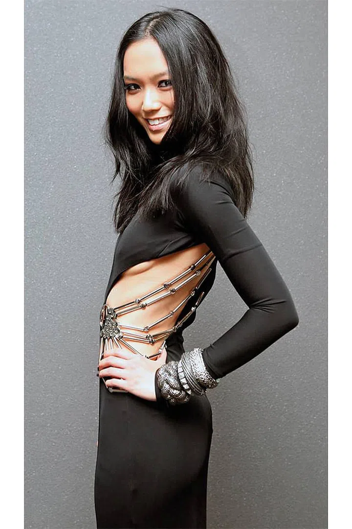 性感女神要属白薇秀,她的Bottega Veneta 2012春夏系列晚礼服,上身采用深V剪裁,下半身则以透视薄纱为裙摆,露出修长美腿,展现若隐若现的美丽。