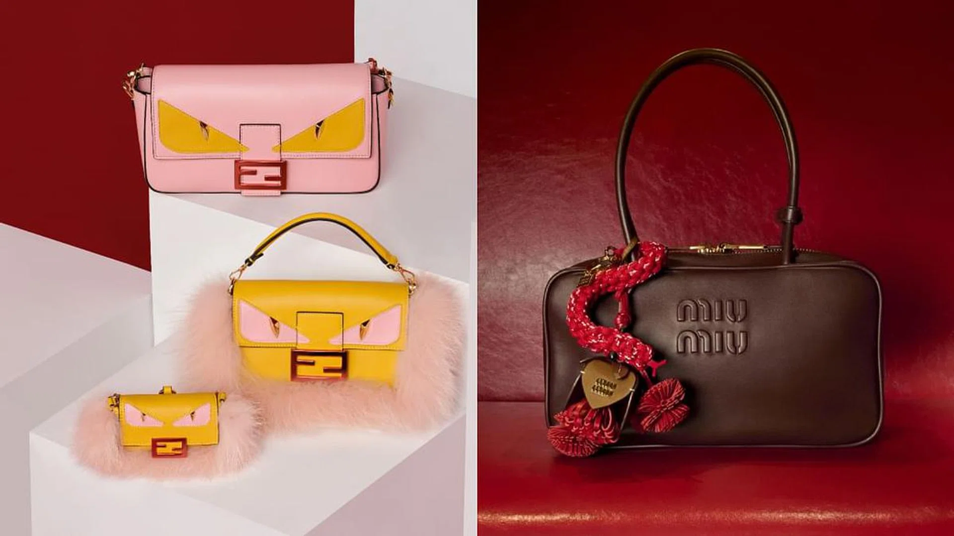 Fendi 2025春节限定系列新品将诞生于2014年的"Fendi Eyes"怪兽之眼元素重新带回大众视野。Baguette手袋选用俏皮的粉色和黄色为基调,搭配红色珐琅FF包扣,小号和Nano Baguette手袋则在黄色小牛皮包身边缘勾勒浅粉色狐狸毛皮草饰边,为包包提升可爱度。