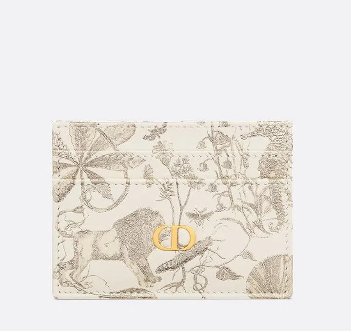 来自Dior的Caro Freesi卡夹采用奶白色牛皮革精心打造,饰以艺术家Pietro Ruffo设计的金色Dior Cabinet de Curiosités图案,花卉设计中巧妙融入多种动物元素。卡夹正面印有经典的CD标志,内部设有五个卡槽,既适合日常使用,又是一款兼具优雅与实用性的配饰。
