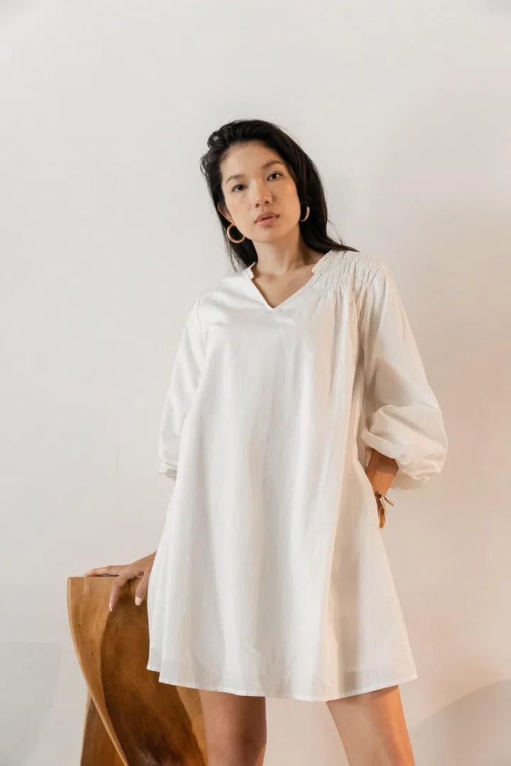 集聚多家亚洲时尚品牌的本地服饰精品店SocietyA,也有不少本地服装品牌。这款宽松的奶白色迷你连衣裙来自新加坡品牌Su By Hand,主打环保面料的使用,采用双层泡泡袖设计,让服装更有蓬松感,搭配精致的领口和不对称的手工皱褶细节,简单却不失高雅。