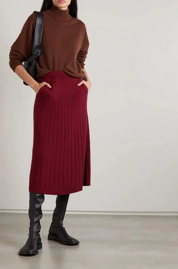 低调奢华的Loro Piana,以细腻的羊绒服装为名。这款Loro Piana及膝半身裙质地柔软,风格优雅,罗纹纹理仿佛给裙身添上了细腻褶裥,搭配飘逸女衫,穿出精致女人味。