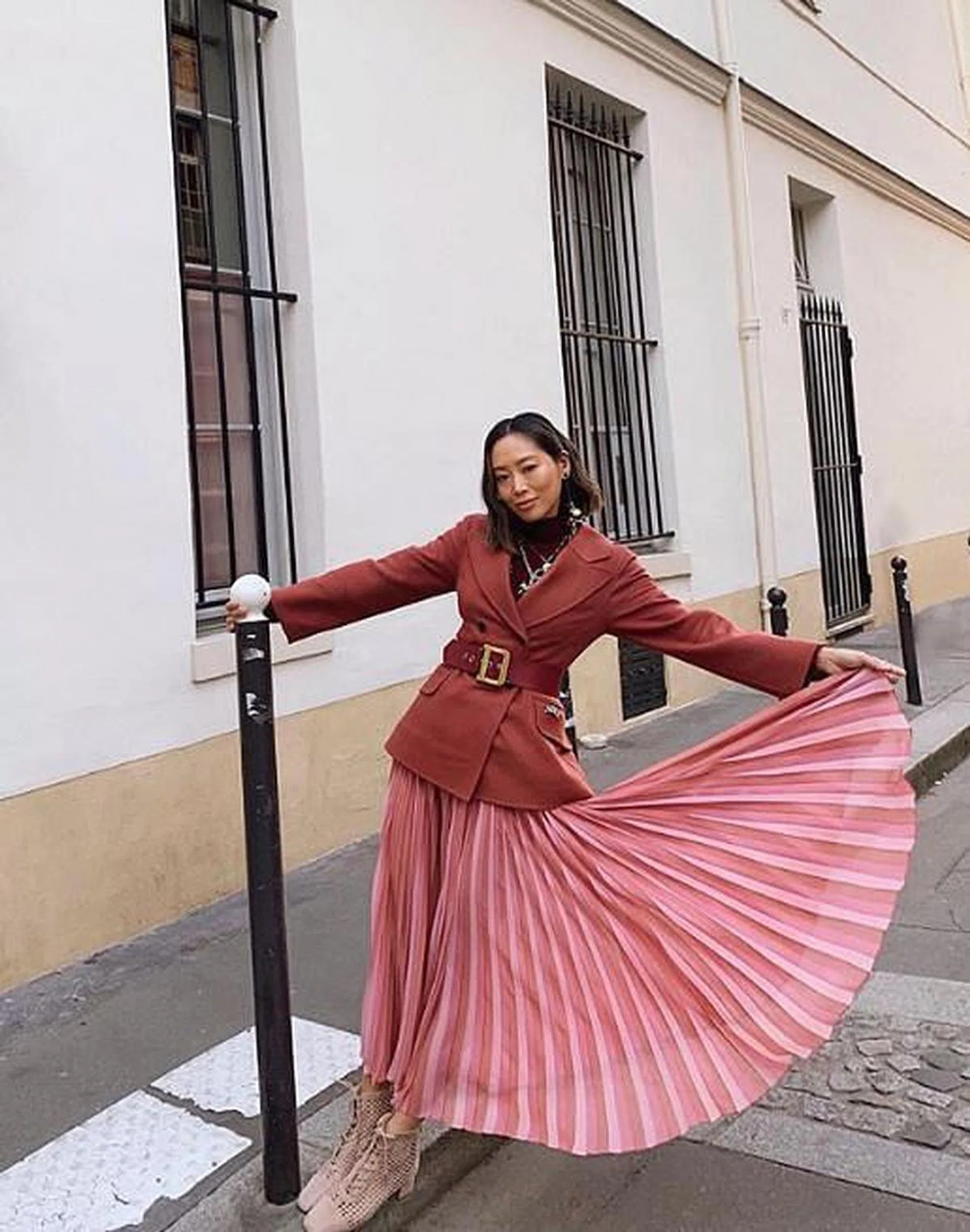 西装外套天生就是方正的线条,难以突显女性玲珑身段。但Aimee Song巧妙地在腰间系上厚腰带,突显身材。