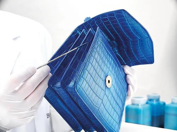 宝格丽皮革大师采用独特的“Perlage”饰面技术处理珍稀鳄鱼皮革。