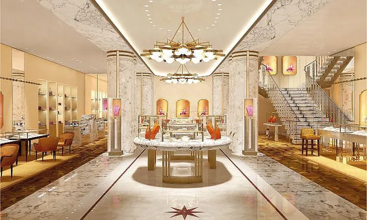 467平方米的零售空间,门店前方耸立着的黑色仿古大理石,演绎罗马式建筑的壮丽恢弘。入口处铺设的Bois Jourdan大理石砖,则饰有与罗马康多提大道旗舰店同款的八角星标志,图案由红色斑岩砌成。八角星象征着宇宙的平衡、和谐与秩序。八条线代表了北南东西四个方位和四季更迭。在神话中,八角星意为“Roma Caput Mundi”,即“条条大路通罗马”,如今也演化为宝格丽全球精品店的统一装潢标识。