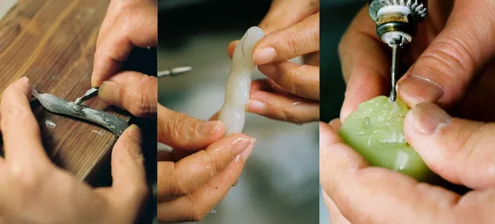 品牌委托三位玉雕大师分别创作了三款限定玉石吊饰,并搭配18K金链。程磊的白玉吊坠刻画了豌豆荚的造型,缀有一只蜗牛,象征着福禄寿的传统含义。邱启敬的烟紫色吊坠则是茄子造型,形如高升之冠,象征幸福与成功。殷小金的玉雕作品中的碧绿色吊坠为白菜造型,上栖一只蟋蟀,象征繁荣与富足。