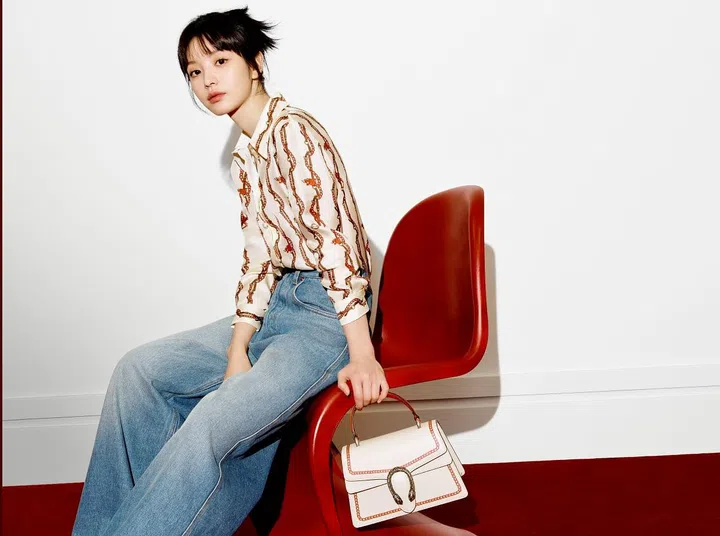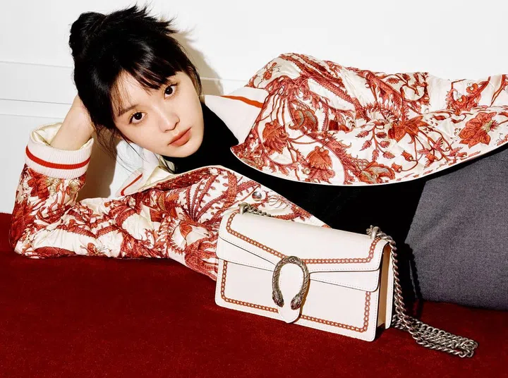 广告大片由演员兼品牌挚友田曦薇和周翊然出镜。女裝部分以红白双色和亮面材质为核心,包含花卉图案的版画风格装饰洋装,将马衔和皮带元素融入条纹装饰的白色毛衣。此外,龙与火焰图腾巧妙藏匿在翻领外套的各种细节中。