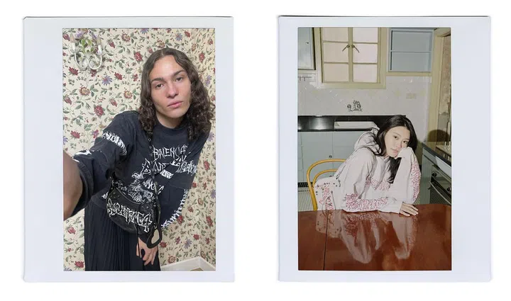 doodles涂鸦风格的手绘标识印花长袖T恤、连帽衫、牛仔夹克,搭配Le Cagole手袋—-反复出现的Balenciaga标识图案充满趣味,更轻松衬托整体造型。