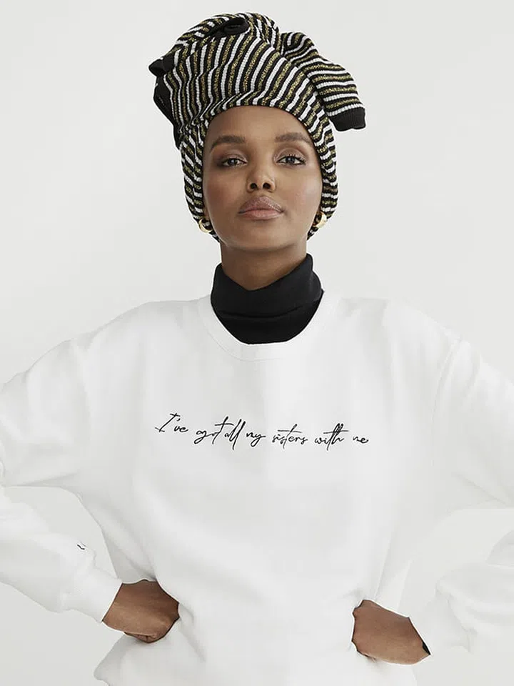 模特儿 Halima Aden 身着The Range x International Women's Day 刺绣棉质混纺毛巾布卫衣。