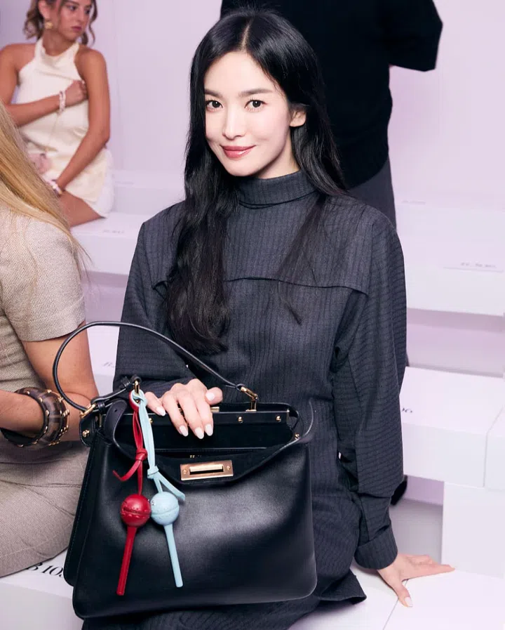 Fendi品牌大使、韩国演员宋慧乔身穿深灰色套装,简约大方,细腻的剪裁与色调彰显出低调奢华的风格。Fendi Peekaboo手袋上的FENDI x Chupa Chups®棒棒糖缀饰为整体注入俏丽感。