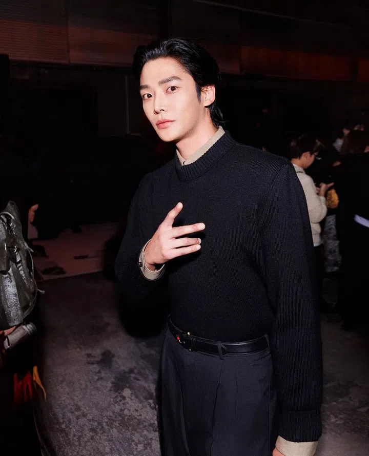 韩国演员Rowoon身穿黑色毛衣搭配同色系长裤和腰带,看起来神秘帅气。