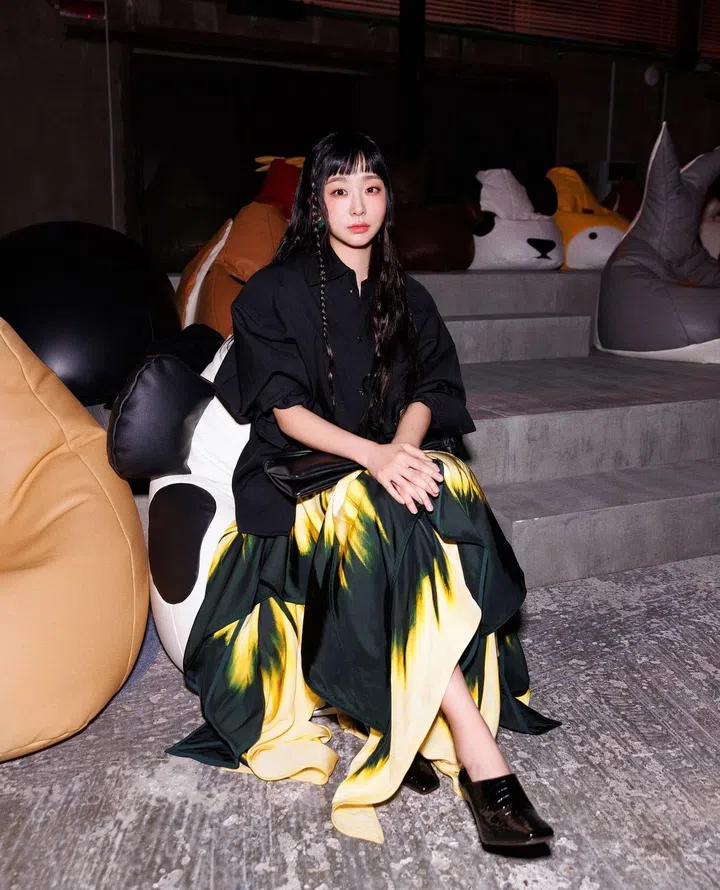 韩国演员金多美身穿Bottega Veneta宽松黑色衬衫,搭配印花半身裙,别具个性美。