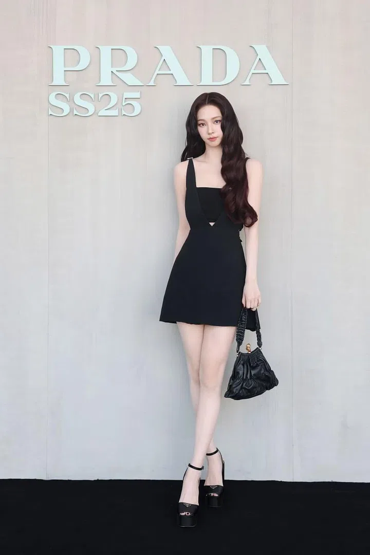 Prada代言人、韩国女团aespa成员Karina身穿一袭Prada黑色迷你连衣裙,完美演绎她“人间AI”的称号。