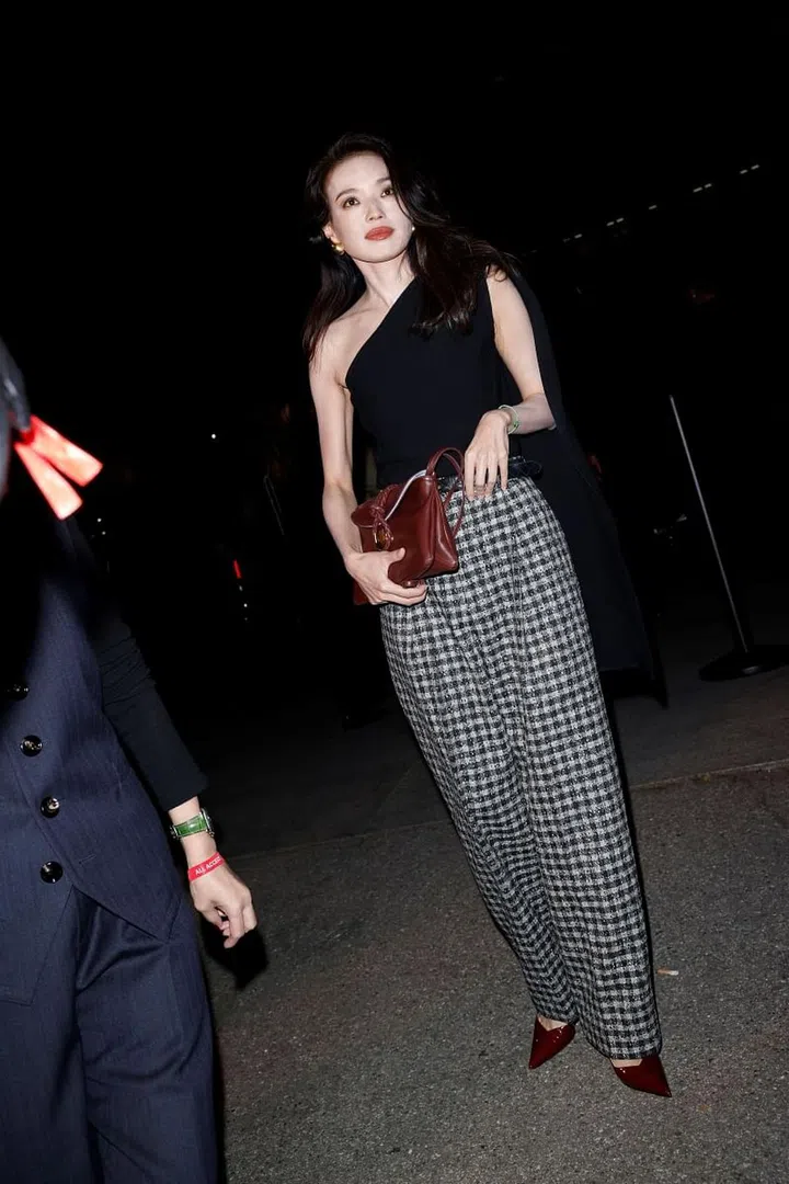 Bottega Veneta全球品牌大使舒淇选穿品牌削肩上衣和格纹西装裤,拎上新款Liberta手袋,气质非凡。