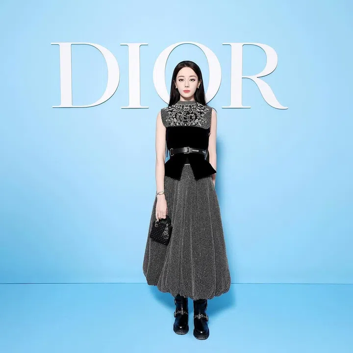 Dior全球品牌大使迪丽热巴身着Dior 2025早春系列刺绣丝绸天鹅绒上衣和刺绣气球裙,并佩戴品牌配饰。