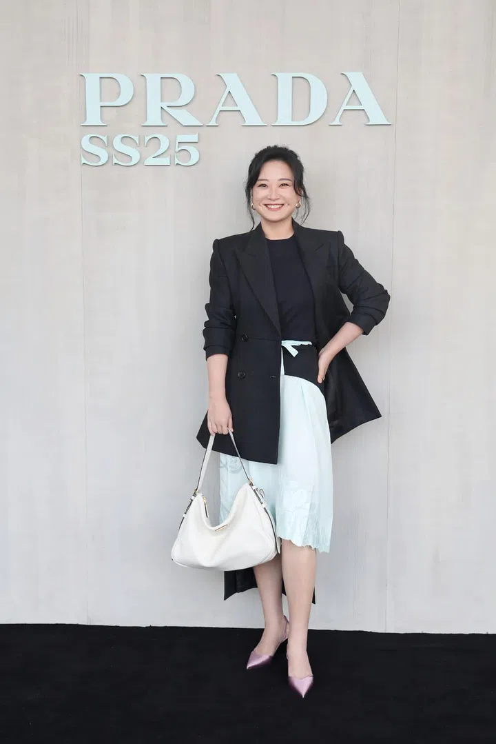 Prada代言人、中国演员贾玲身穿利落的黑色西装外套搭配白色半身裙,手提新款Prada Aimee手袋,演绎女性力量。
