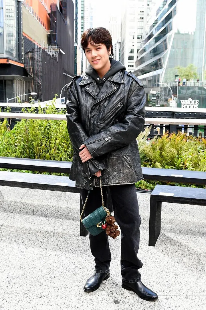 泰星Nanon以宽大的黑色皮衣和连帽衫,搭配Times Square Tabby肩袋,诠释酷炫帅气的风格。