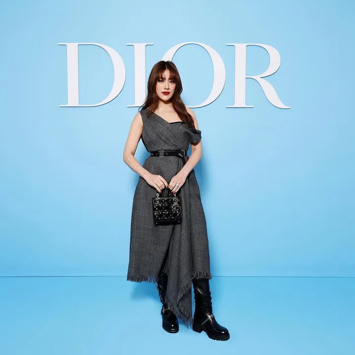 Dior品牌大使Kimberley Anne Woltemas身穿 Dior 不对称灰色羊毛连衣裙,并佩戴品牌配饰。