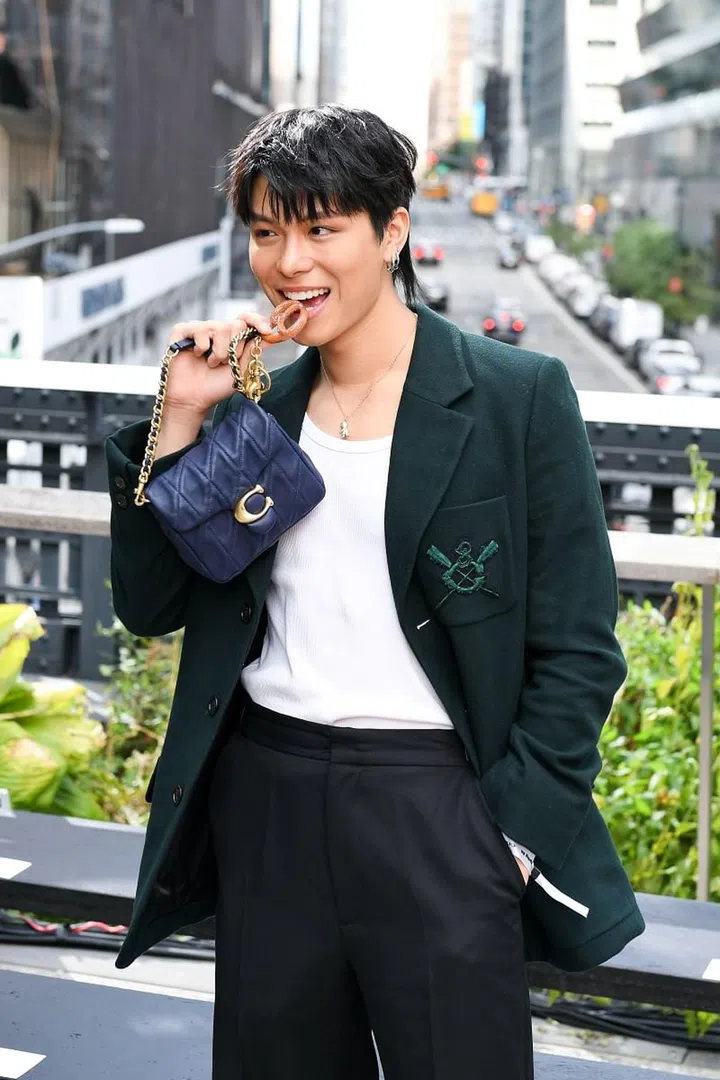 容启航身穿墨绿色帅气西装外套,搭配Coach Times Square Tabby肩袋,手袋上还缀以可爱的pretzel挂饰。