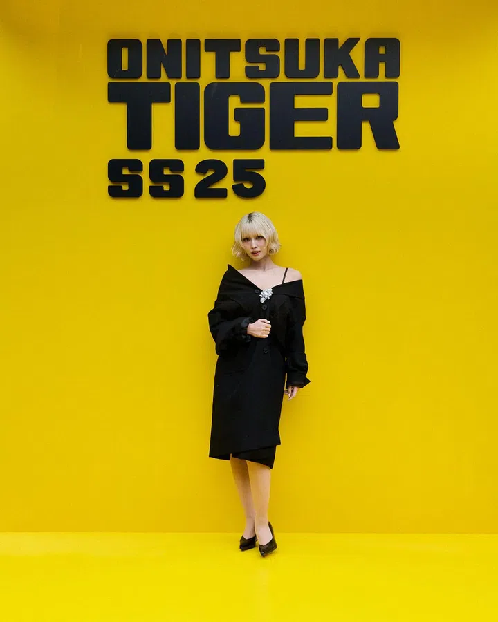 Onitsuka Tiger品牌代言人身穿黑色露肩洋装,搭配一头美丽金发,魅力十足。