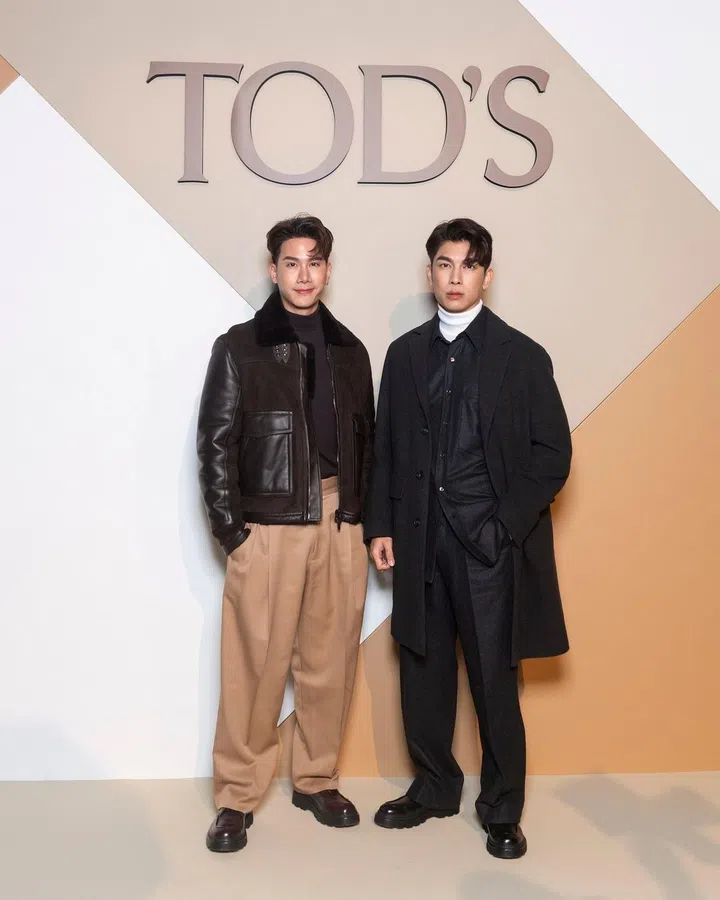 泰国两大BL剧男神Tul Pakorn和Mew Suppasit现身Tod's秀场,黑色与褐色造型巧妙营造和谐感。