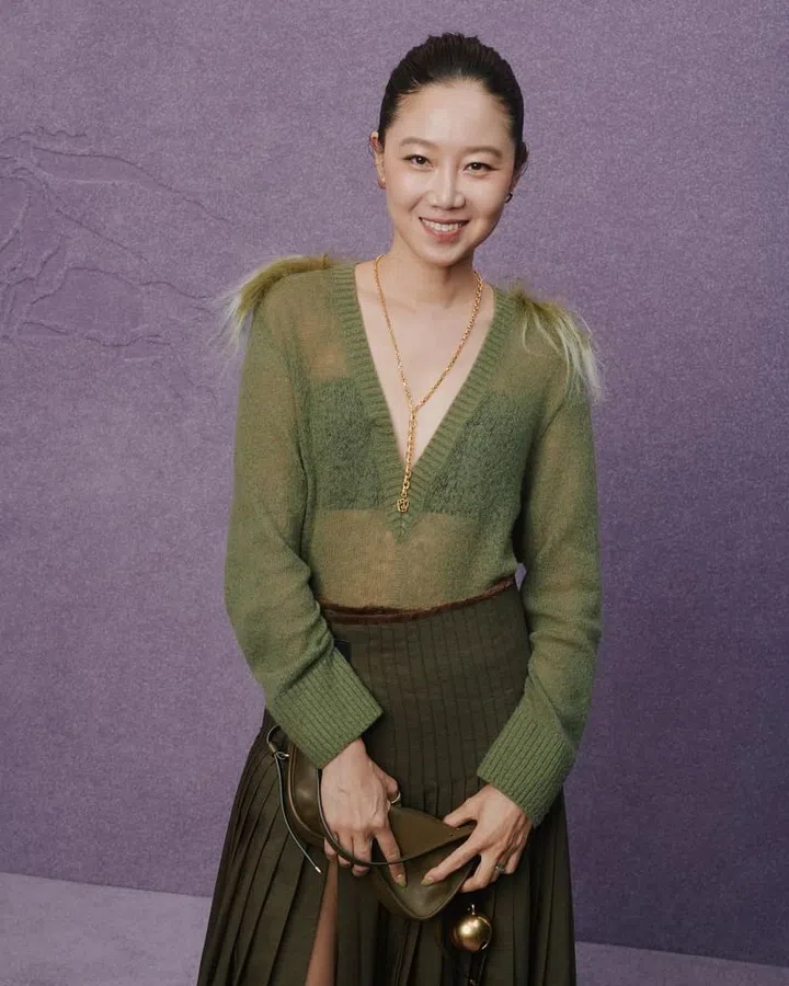 韩国演员孔晓振身穿Burberry墨绿色透视针织衫,搭配咖啡色百褶裙,呈现成熟与性感兼具的独特气质。