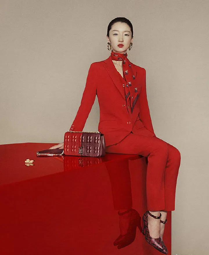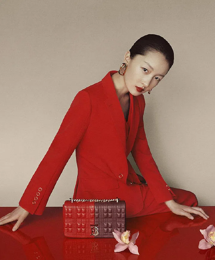 Burberry代言人周冬雨以一袭亮红量裁西装搭配拼色 Lola 包,释放优雅与摩登兼具的气息。