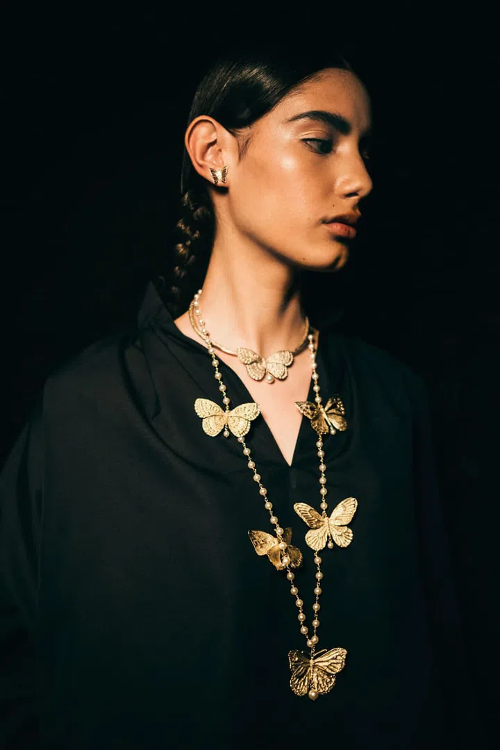 系列中的一件粉色裙装令人联想起Frida Kahlo于一幅自画像中所穿着的连衣裙。纷繁多样的棉、麻及丝质蕾丝,设计精巧的黑色天鹅绒运动衫领口,以及形似蝴蝶的提花装饰,为作品更添动人柔美气质。半身裙采用天鹅绒面料搭配迷人色调及花冠状裙摆,并以褶皱设计凸显臀部曲线。Toile de Jouy印花中彩蝶漫飞,映衬墨西哥大自然景象中的动植物,包含启发Frida Kahlo创作灵感的鹦鹉、猴子与天堂鸟。从珠宝配饰到精致鞋履,蝴蝶成为贯穿各式造型的装饰性元素,以精美刺绣、印花等细节呈现。