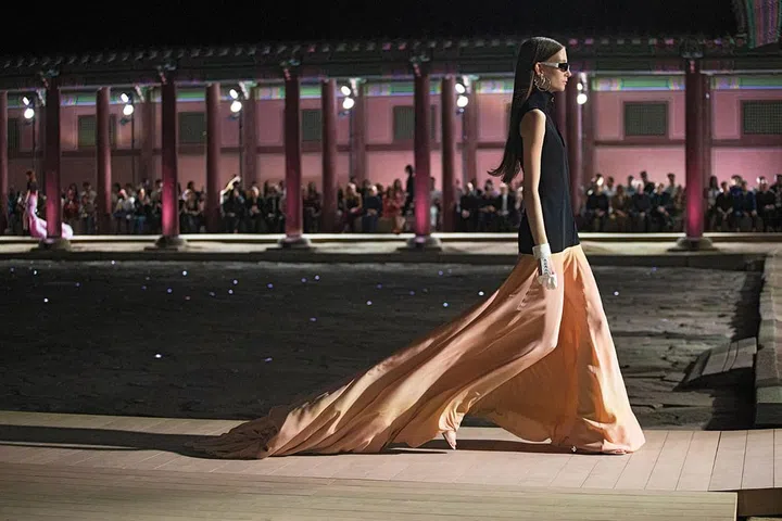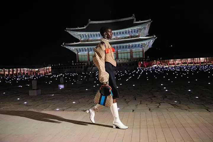 在韩国首尔盛大登场的古驰(Gucci) 2024早春系列,是首个在韩国古迹景福宫(Gyeongbokgung Palace)发布的时装秀,集结了获奖无数的韩国黑色幽默惊悚剧情片《寄生上流》(Parasite)配乐作曲家郑在日(Jung Jae-il)打造的秀场配乐、由Wladimir Schall演奏、韩国超模崔素拉(Sora Choi)开场,以及韩国新锐艺术家Ram Han的艺术创作,凸显多元文化交流的张力。