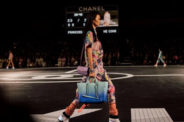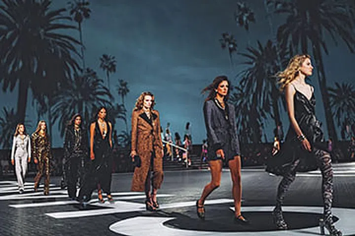 时装秀在洛杉矶派拉蒙电影制片厂(Paramount Studios)登场,服装也以洛杉矶和好莱坞的五光十色为主题,灵感来自1920、30年代电影世界的奢华魅力,融合1970、80年代风靡的韵律动感美学,呈现穿越时空的美学剧本。为呼应当地的明媚阳光和奔放热情,Virginie Viard也融入绚烂的配色,包括渐变粉彩和鲜明色调,平衡了品牌标志性的黑白色彩。系列中还包含各种深浅粉红色调和象征极致高雅的金色,不禁令人回忆起好莱坞的黄金岁月。