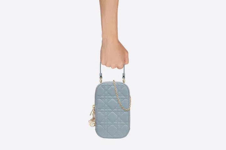 追求经典隽永风格的你,这款 Lady Dior 手机袋是优质之选。以云雾蓝羊皮革制作,饰以藤格纹缉面线和可拆卸的D.I.O.R.吊饰,搭配手柄和可拆卸的链条肩带,可手提或斜挎,展现温柔高雅的气息。