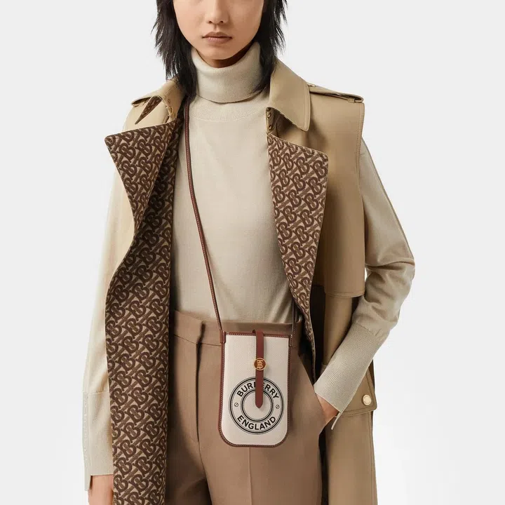 Burberry斜背式手机袋,结合徽标图案印花帆布及皮革材质,搭配马术风格的皮革饰袢,设有Thomas Burberry专属标识装饰的开合与外部卡位,风格休闲文艺,精巧尺寸满足日常需求。
