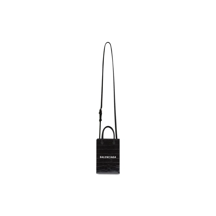 Balenciaga潮酷的手机袋,长方形外观设计犹如迷你购物袋,使用方格牛皮革制作,配搭可调长度的斜挎肩带,正面印有品牌标识,经典的黑底白字设计也相当耐看百搭。