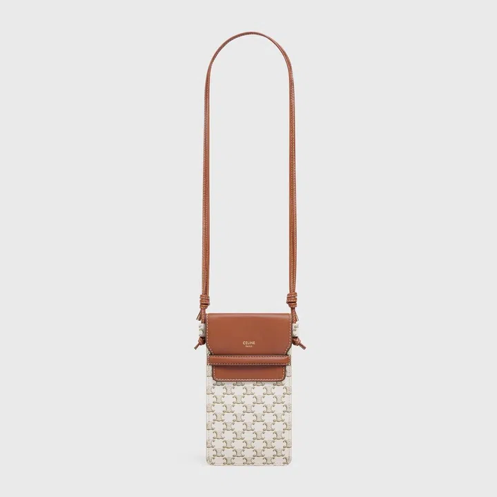 Celine的翻盖手机包,以印有老花图案的Triomphe标志羊皮革制作,设计经典不过时。收纳隔层方面,除了一个主隔层外,另设了2个放置信用卡的卡槽,亦附可调校全皮肩带,可按喜好挂肩或斜背。