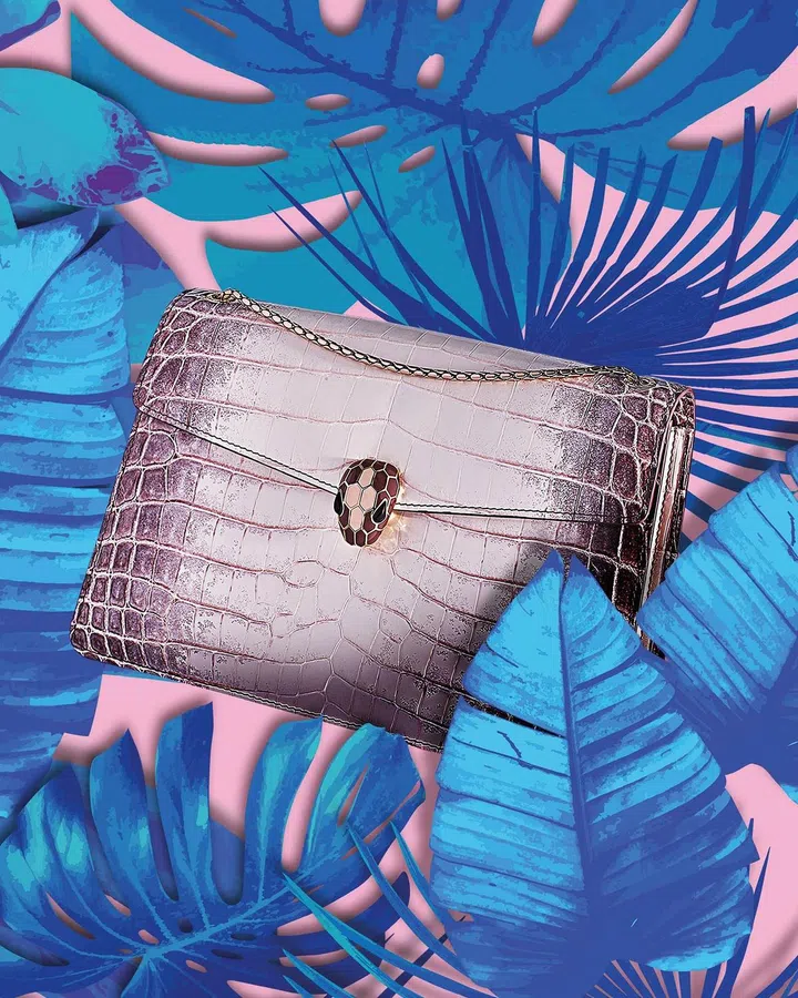 宝格丽(Bvlgari)的2021秋冬皮具和配饰系列,从灵蛇的无尽蜕变中汲取灵感,再次探索经典手袋与珍稀皮革的无尽可能。图中精美的鳄鱼皮革手袋来自Serpenti Himalayan Croco系列,以精致的稀有皮革闪烁莹莹光辉,采用从白色到米黄色与灰色的渐变色调,先用过半脱色处理,再经桶染,凸显皮革本身的自然色泽,绝对是奢华的代表。