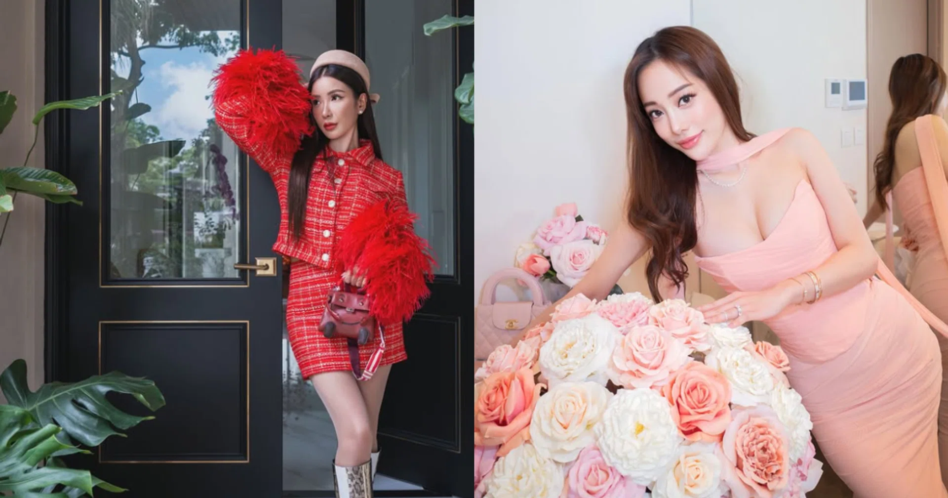 名媛Serene Chua身穿红色紧身连衣裙,与手中的鲜艳玫瑰花束相互映衬,营造满满的浪漫氛围。