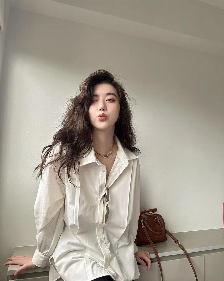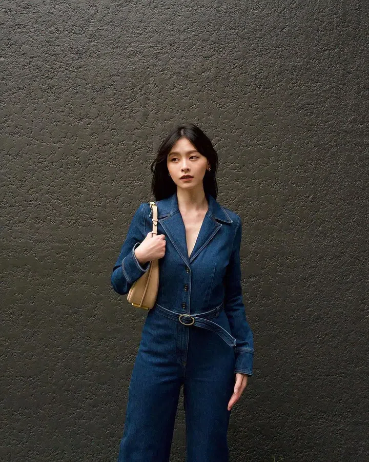丹宁成衣是时髦女孩衣橱里必不可少的单品。 何盈莹身穿 & Other Stories 牛仔连衣裤,腰部稍稍内收搭配腰带,喇叭裤脚散发出70年代风情。