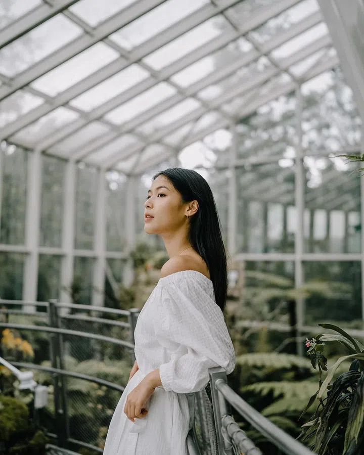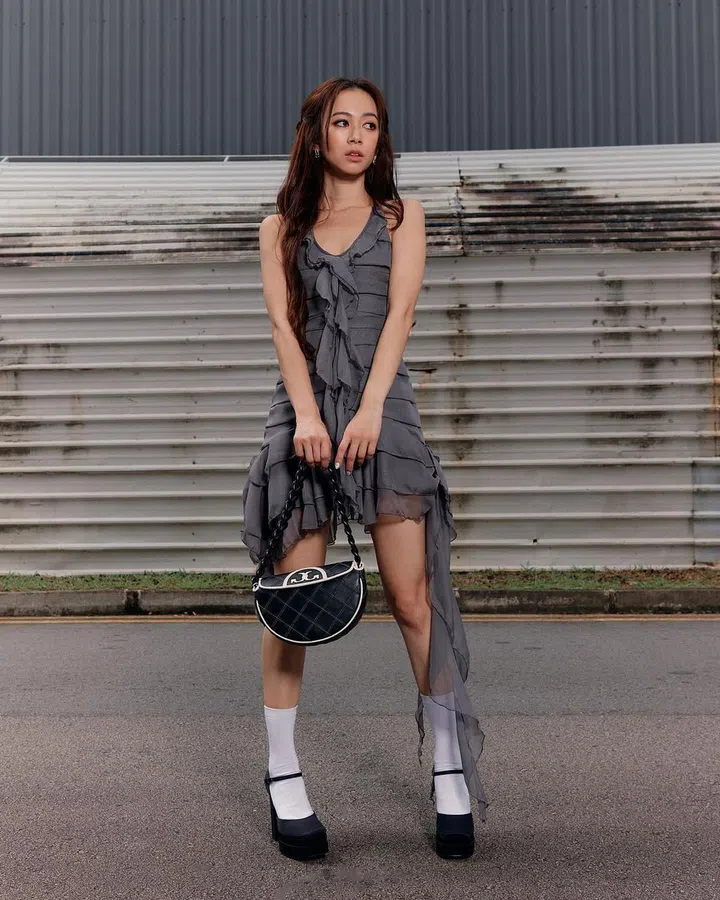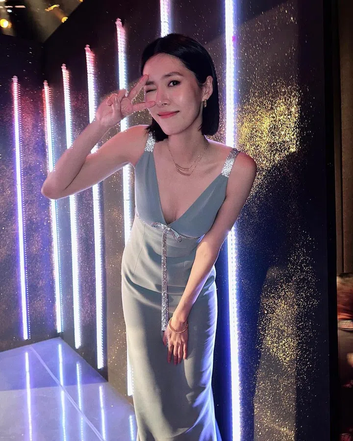 温柔的丝缎洋装,以闪亮的银色肩带与环绕胸围的蝴蝶结装饰做点缀,衬托出黄思恬高雅气质。