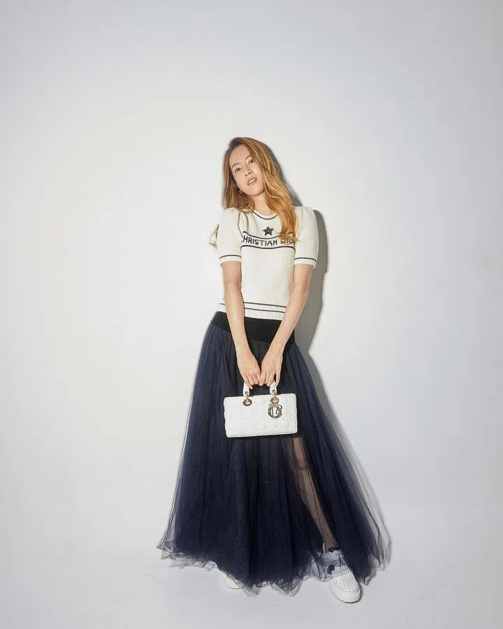 郑颖身穿Dior黑色小花薄洋纱与短袖针织衫,结合典雅气质与现代风范。若隐若现的半裙,采用黑色小花薄洋纱精心制作,喇叭形剪裁醒目时尚,打造精致造型。