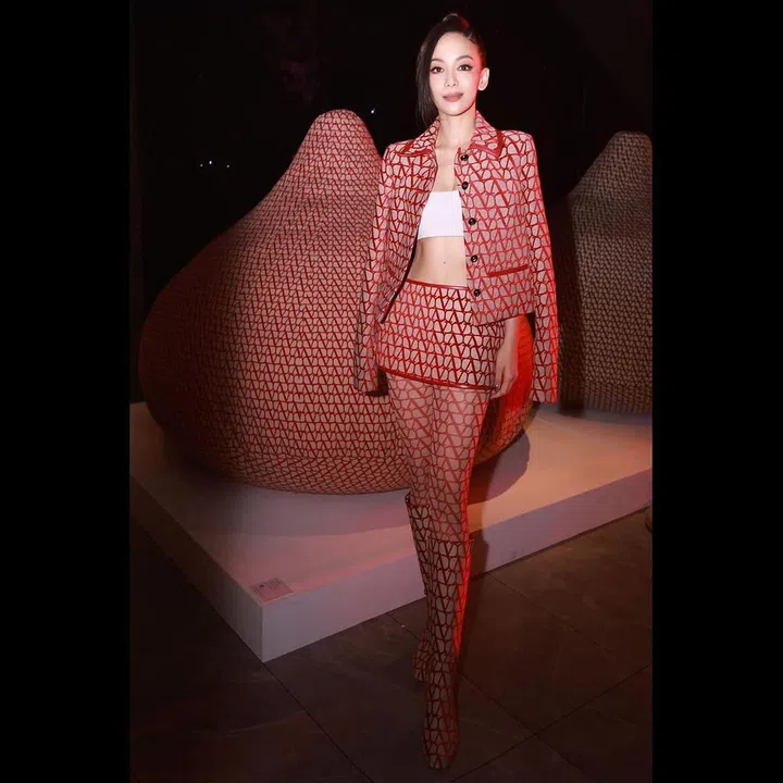 满满的logo元素! 谢宛谕这一身造型来自Valentino,由创意总监Pierpaolo Piccioli设计,套装上的Toile Iconographe老花图案首现于2023春夏秀台,随后迅速成为品牌的新一代特色元素,十分吸睛夺目。