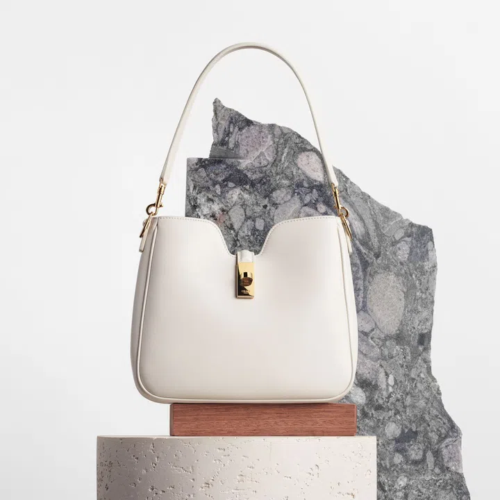 Celine 2025春季系列新款Camille 16 Soft肩背包,新作延续16系列标志性半圆形金属旋锁设计,采用方形hobo轮廓搭配带扣开合。此款为白色小牛皮版本,里衬为羊皮革,配有长短两根可拆卸可替换肩带,利落的包型呈现干练潇洒气息。