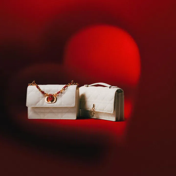 来自Dioramour限定系列的Dioramour Miss Caro迷你手袋,颂扬Dior对爱情和浪漫的演绎。新手袋采用奶白色羊皮制成,缀以大型藤格纹图案缝线,特别之处是结合复古金色饰面金属CD标志和红色树脂心形装饰,搭配交替的古金色饰面金属和红色树脂链环,以唯美的爱情符号传达情义。
