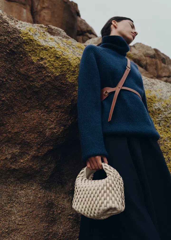 以橡树树皮的纹路为灵感,Polene Onda系列手袋以其独特外观和纹理向自然致敬,皮革环扣的排列为手袋赋予动态的视觉效果。此款Beri Onda手袋以柔和的奶白色,搭配优雅包身,散发低调与奢华。