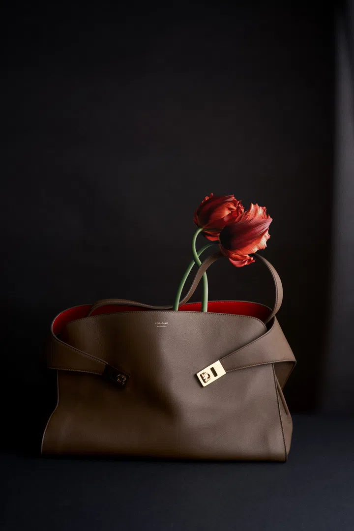 Ferragamo Hug 手袋于2023秋冬首次亮相的Ferragamo Hug手袋,采用摩登大气的包身,缀以两条由后方绕至前方的Gancini金属饰带,将现代女性之美完美衬托出来。
