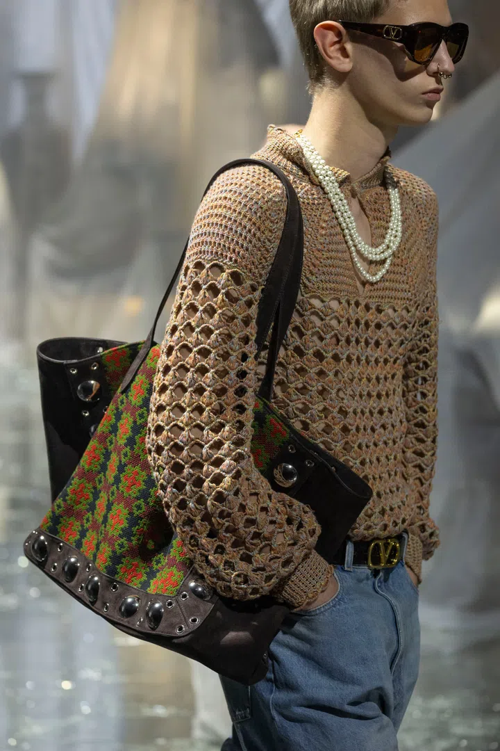 本季,Valentio延续对“嬉皮奢华”的探索,在Nellcôte系列中注入更多材质与工艺巧思。除中号托特包外,2025早秋系列亦推出迷你尺寸新作,选用小牛皮与麂皮,搭配刺绣镜面、几何提花、缤纷珠片与立体花卉等装饰,展现多元风格与精致质感。