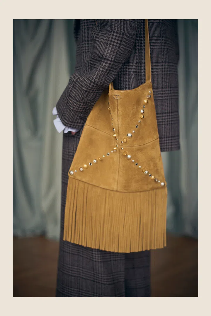 Valentino Garavani Nellcôte手袋出自创意总监Alessandro Michele为Valentino打造的首个系列——2025早春度假Avant Les Débuts系列。设计灵感源自Valentino的经典档案,以麂皮材质打造,分为斜挎包和托特包等款式,饰以金属钉饰与孔眼细节,展现出60年代个性魅力。包袋容量宽敞,可容纳平板、书籍、水瓶与薄外套,兼具实用与时髦态度。