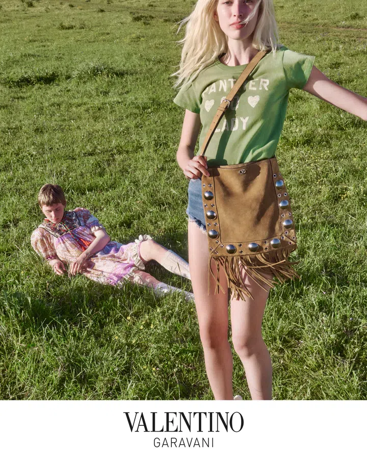 全新Valentino Garavani Nellcôte手袋广告大片由创意总监Alessandro Michele亲自策划,并邀请摄影师Julie Greve掌镜,取材于1960至70年代的波西米亚文化:阳光洒落草地,镜头捕捉一群朋友肆意欢笑、相拥、跳舞的自在瞬间,彷若置身梦幻音乐节。Nellcôte手袋则悄然整体造型的点睛之笔。