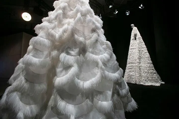 Valentino每一季的高级定制系列都让人看得目不转睛,未知着迷。特别是2020年秋冬高定系列,携手艺术家Nick Knight打造的特殊表演,以15套纯白礼服为画布,利用现代数码投影技术,将色彩与印花投射在裙摆之上,模特们身着巨型礼服被威亚高高吊起,一同建筑高定梦境。