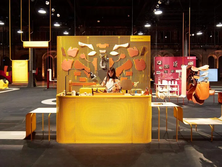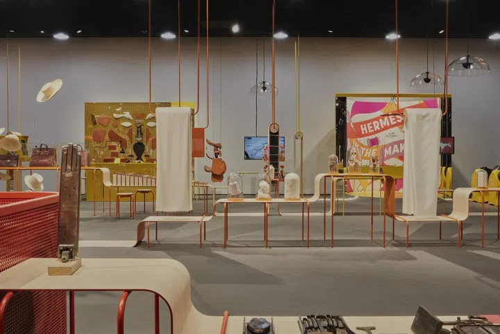 以工匠们的工作台为灵感,“Hermès in the Making”展览采用开放式的布局,来呈现品牌历史与生命的四大主题:对传统手工艺的保护与发展、遵循优质材料的特性、专注产品耐用性、爱马仕地域锚定效应。